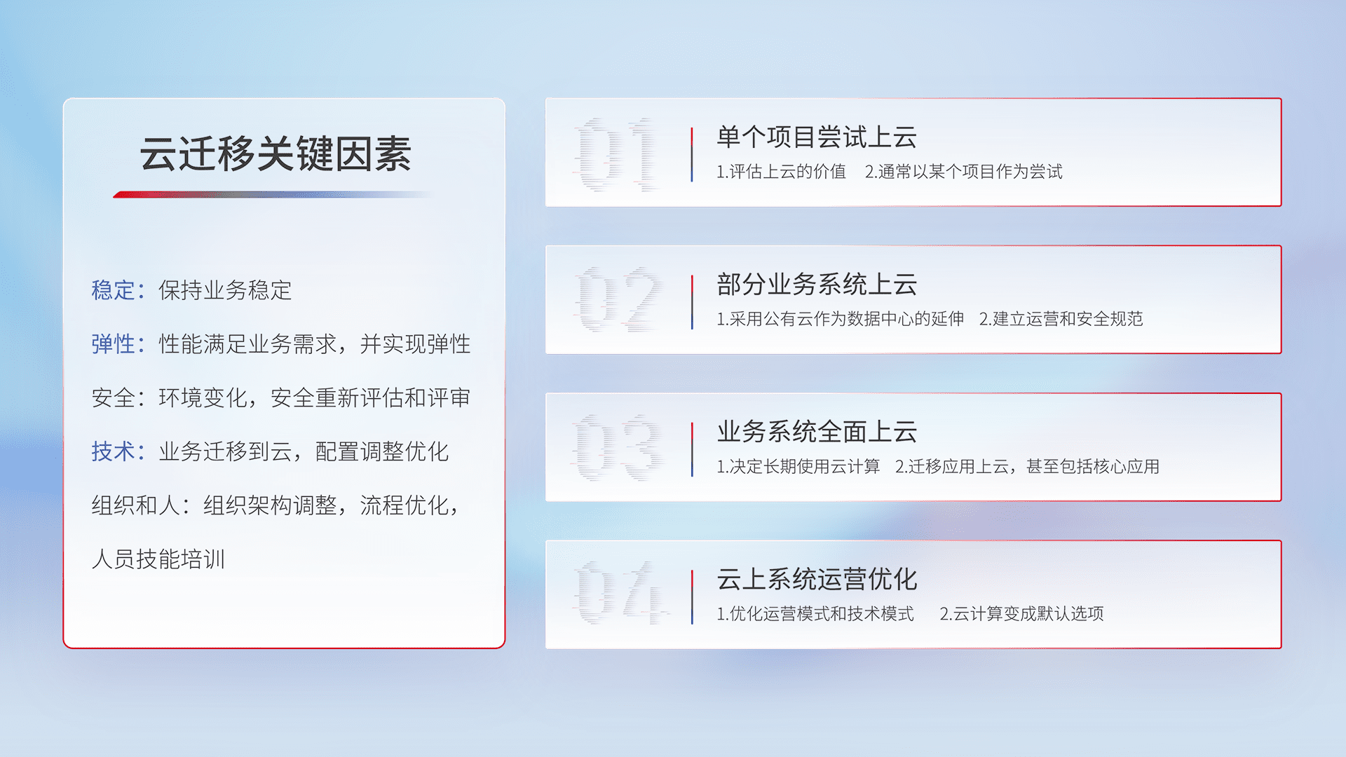 结合实际业务,,,从规划设计、、、云平台选型、、、、云原生改造、、数据迁移、、、集成交付,,,迁移全过程为客户识别最佳上云路径,,做好风险识别管理,,,设计网络架构、、身份权限、、、、安全审计合规、、、、操作审计、、日志审计、、、监控告警策略、、、多站点容灾设计等,,,对云上基础设施进行整体规划,,提升IT治理水平,,,,以满足弹性、、高可用、、、、高性能的需求。。。。