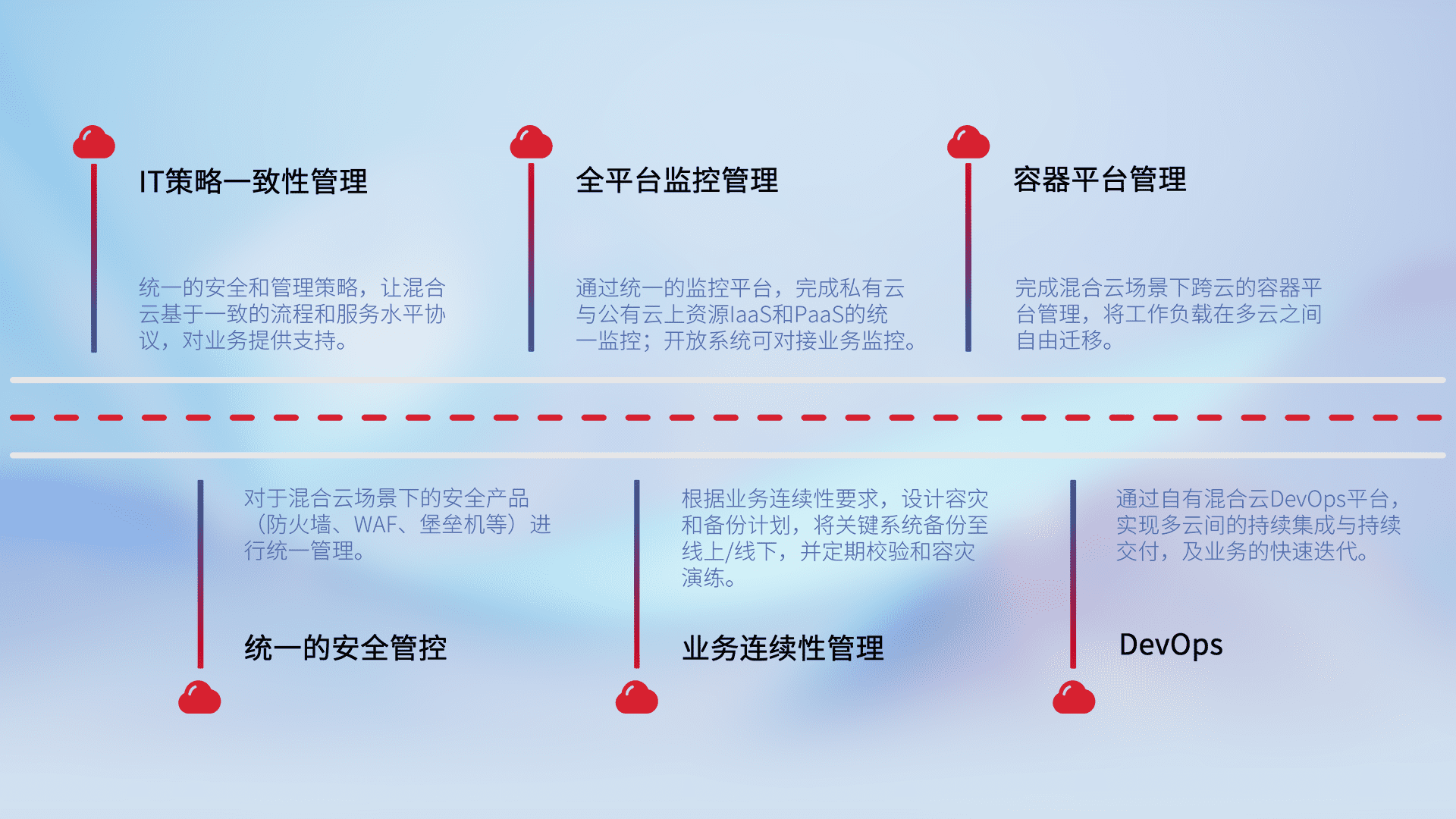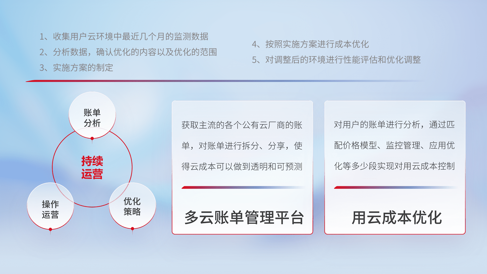 通过多云纳管,,,以统一的资源数据模型把客户的云资源进行抽象和封装,,进而实现对多云资源的统一操作,,,保障云资源管理的可靠性、、、稳定性与可用性。。。量身定制化运维内容,,,,配置、、、、开发运维、、补丁管理、、、备份、、监控、、、、认证和访问管理、、、审计和日常巡检等,,,,保障在用云过程中的可靠度,,,,稳定度以及高可用率。。。